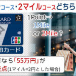 - ANA JCBカード、1マイルコース・2マイルコースどちらが良いは、単純計算なら55万円が損益分岐点(1マイル=2円の場合)。